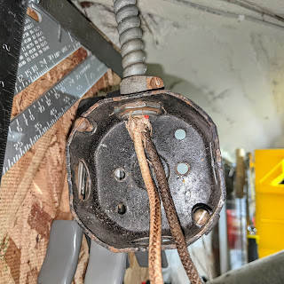 For what ever reason, this particular cable had both conductors , back and white wired together - a switch loop. There wasn't an issue with the switch loop, however there was an issue having exposed wiring. I decided that it needed to be shortened and terminated correctly in a metallic junction box, attached to an exposed joist.